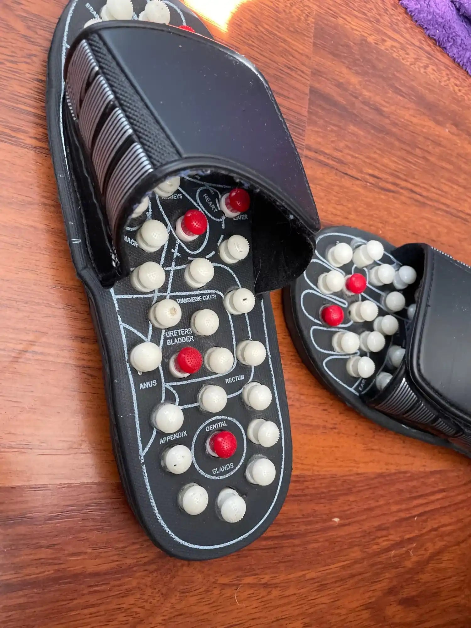 The slippers use acupressure nodes that target specific points on your feet to stimulate blood circulation and relieve pain, providing a soothing sensation and faster recovery.